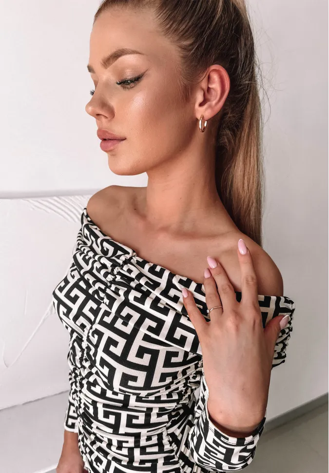 Wyjątkowa sukienka o dopasowanym kroju to niezbędnik w kobiecej szafie. Przy ramionach modelu została wszyta gumka, która zapobiega zsuwaniu się z ramion oraz umożliwia dowolną regulację. Marszenia po całej długości sukienki maskują niedoskonałości sylwetki. Możesz nosić ją klasycznie lub odsłonić ramiona w stylu hiszpanki. Grecki wzór przykuwa wzrok, a sprawia, że Twoja stylizacja stanie się ponadczasowa. Delikatna tkanina zapewnia komfort i wygodę w noszeniu. Ten model połączysz ze szpilkami, ale również sportowymi butami!